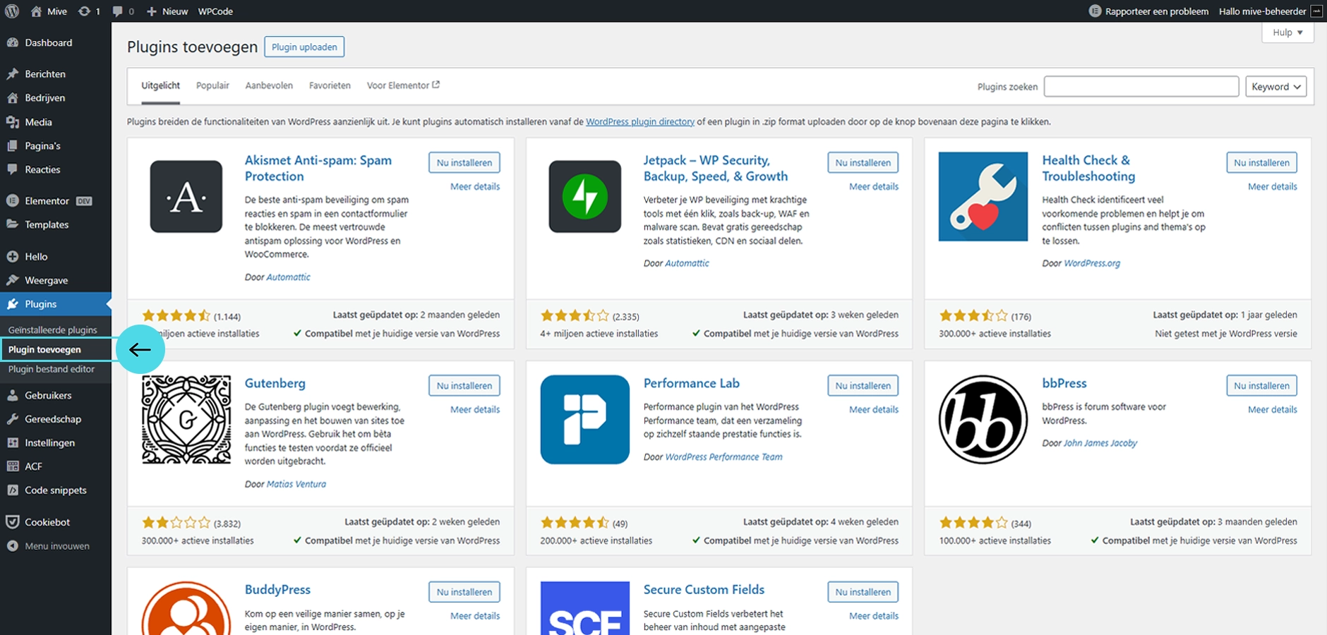 Hier zie je een overzicht van beschikbare plugins in de WordPress-pluginbibliotheek.